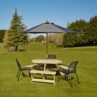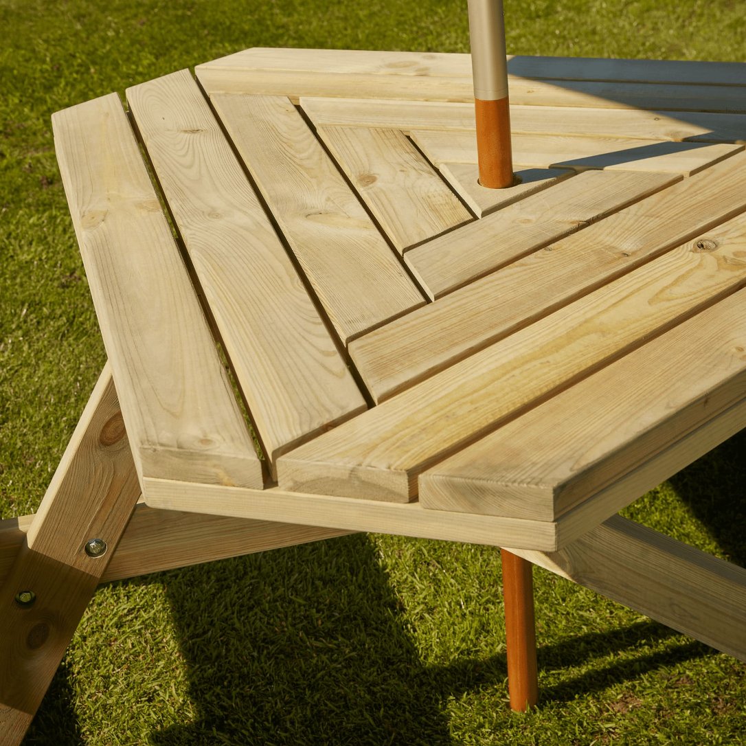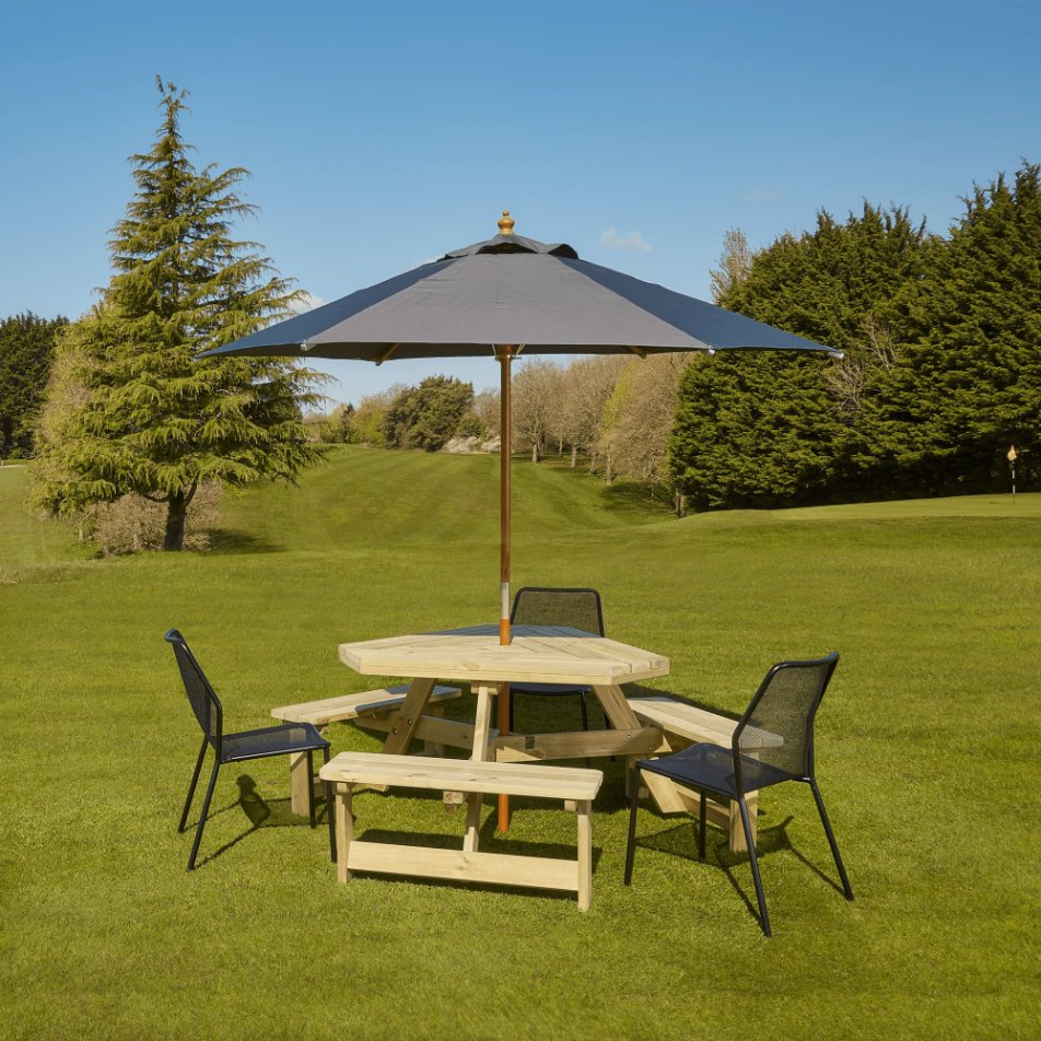 The Winer Diner six seater picnic bench is manufactured from sturdy pine with a 60mm thick top. The distinctive slatted top features a 50mm parasol hole and is very easy to assemble.